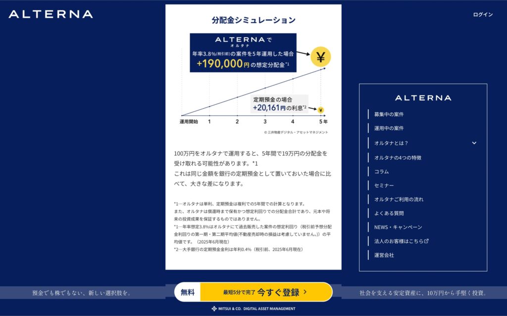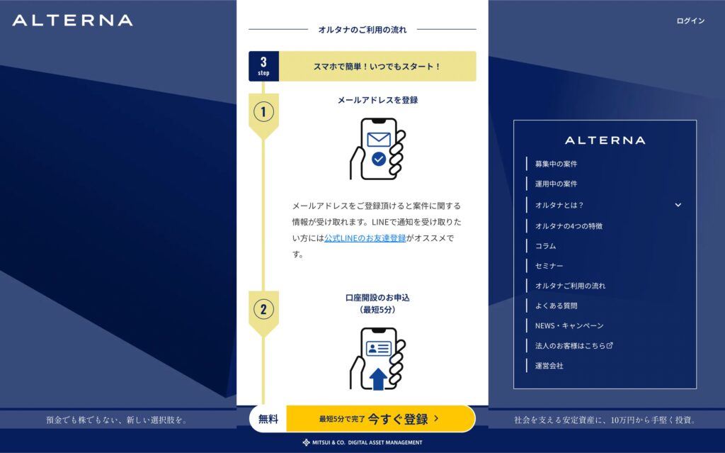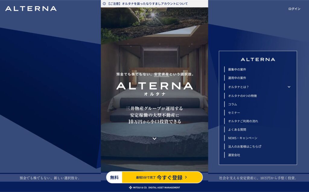 ALTERNAは三井物産グループのデジタル証券サービスであり、オルタナバンクとは無関係です。投資する際は、必ず運営会社と仕組みを確認してください。