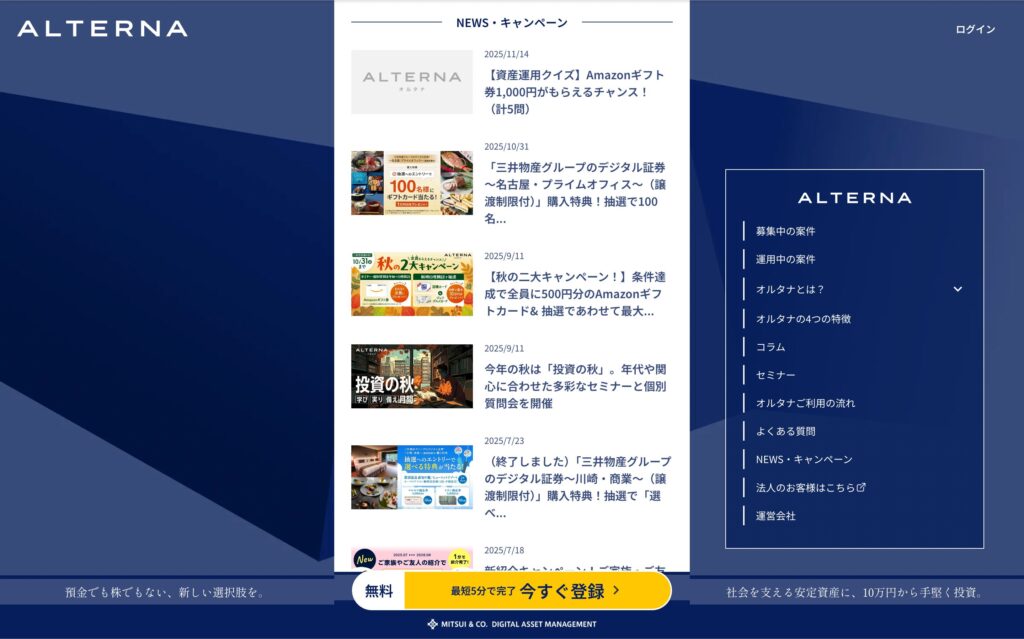 ALTERNA(オルタナ)は、三井物産デジタル・アセットマネジメント株式会社が運営するデジタル証券プラットフォームです。
