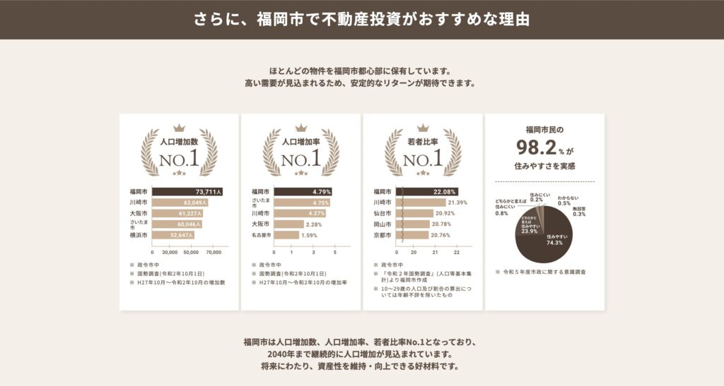 人口が増えるということは、それだけ住宅需要が継続的に発生するということです。人口減少が進む日本全体の中で、福岡市は数少ない成長マーケットの一つと言えます。