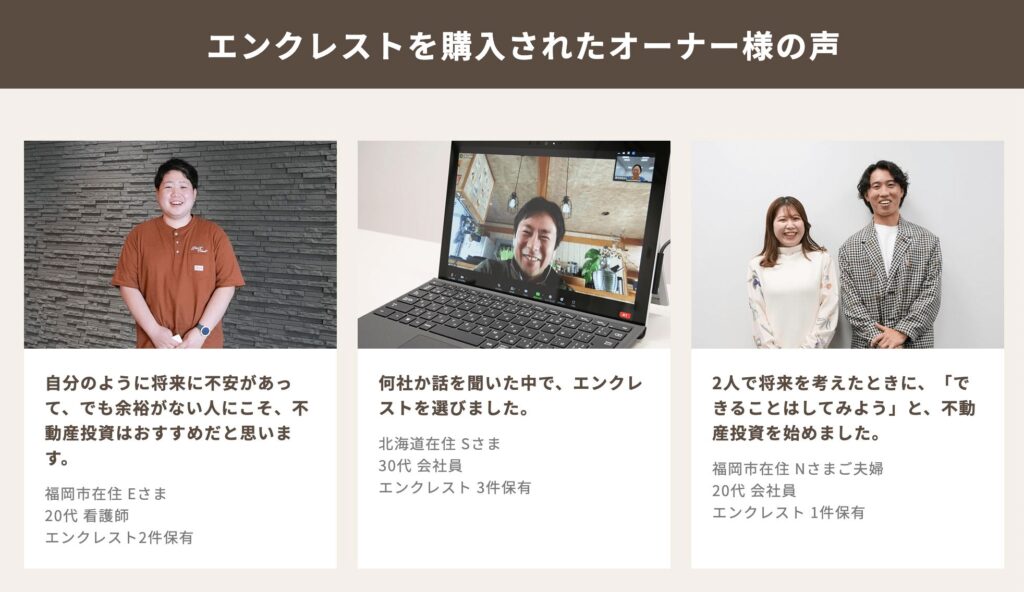 若い世代にも支持されている点は、エンクレストの投資モデルが現代のライフスタイルに合っていることを示しています。