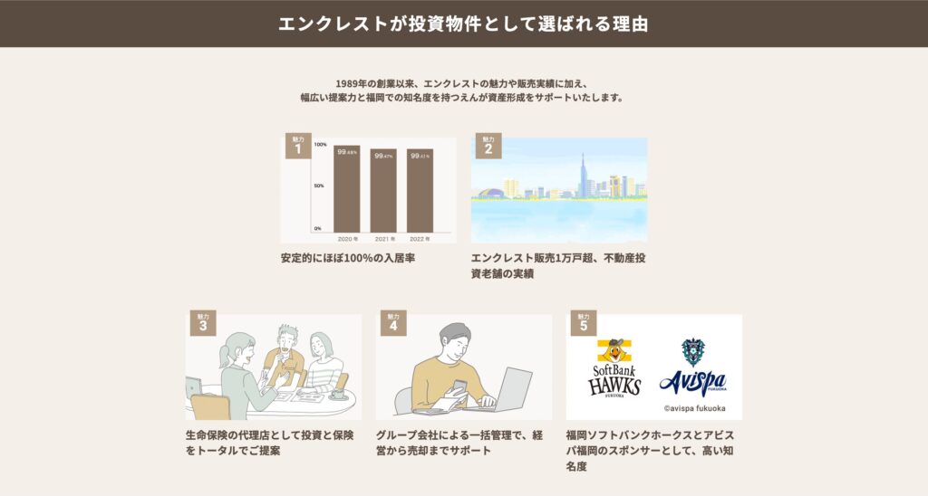 エンクレストは、福岡・熊本エリアで高い実績を持つ不動産投資会社です。人口増加が続く福岡市の将来性、デザイン性の高い物件、充実した管理体制、そして初期費用を抑えた投資スタイルが、多くの投資家から支持されています。
