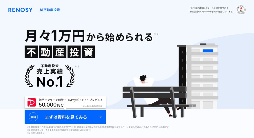 RENOSY(リノシー)は、株式会社GA technologiesが運営する不動産投資プラットフォームです。中古ワンルームマンション投資を中心に展開しており、テクノロジーを活用したサービスが特徴です。