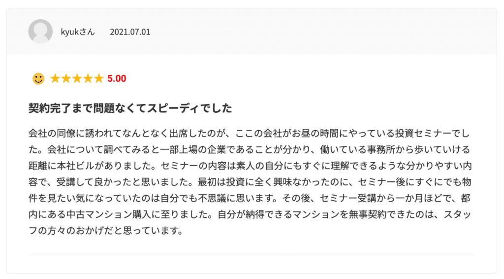 「購入して終わりではなく、定期的に連絡をくれる」「追加投資の相談にも親身になってくれた」といった口コミからは、長期的な関係構築を重視する企業姿勢が伺えます。