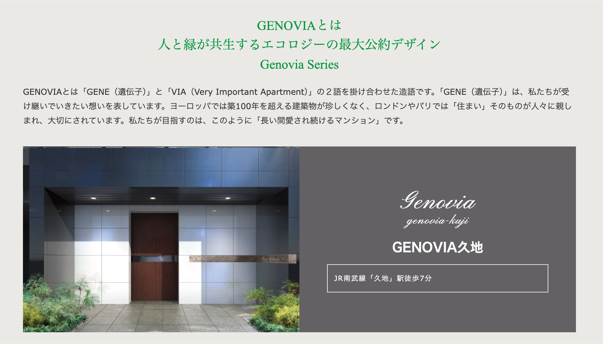 GENOVIAシリーズは、東京23区を中心に展開される都市型ワンルーム・1Kマンションです。ターゲットは単身者・若年層・DINKS世帯で、駅徒歩10分以内を基本とする立地戦略を採っています。