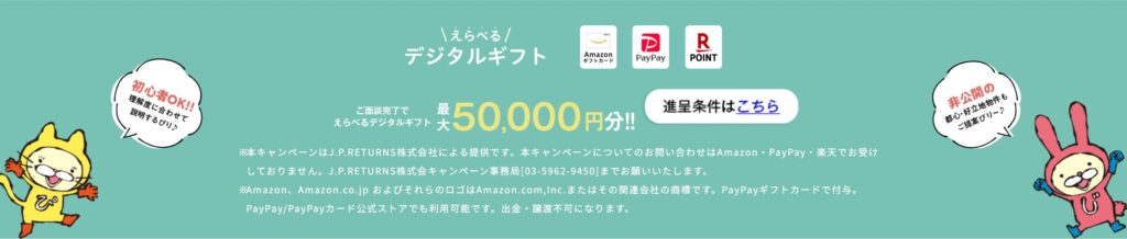 JPリターンズが現在実施している最大規模のキャンペーンが、最大5万円分のデジタルギフトプレゼントです。