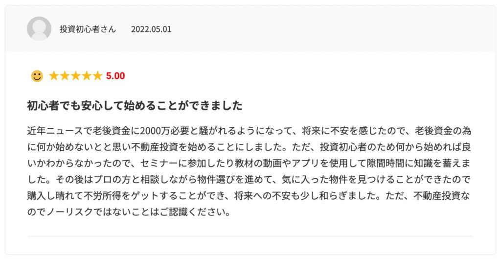 特に注目すべきは、リスクもきちんと提示し、包み隠さず実情を説明してもらえた点が高く評価されている点です。不動産投資にはメリットだけでなくリスクも存在します。