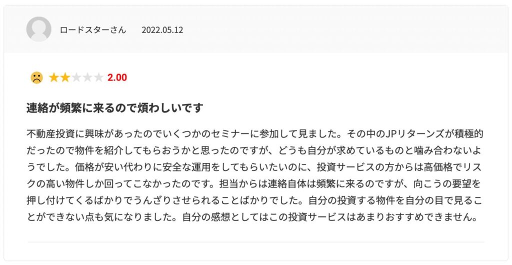 不動産投資会社に対する懸念のひとつが、「強引な営業」です。しかし、JPリターンズに関する口コミでは、「強引な営業がなく、押し売り感が少ない」という声が多く寄せられています。