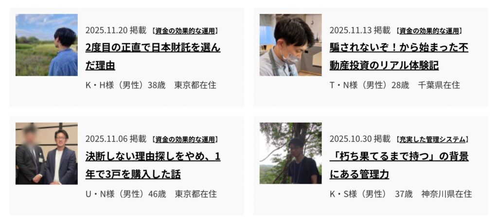 「不動産投資の知識が全くない状態でしたが、担当者が丁寧に説明してくれて、疑問点もすべて解消できました。購入後も定期的に連絡をくれるので、安心感があります」という声が多数あります。