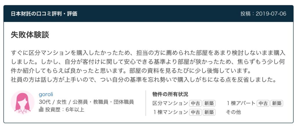 最も多い否定的な口コミが、物件価格に関するものです。「同じエリアの似た物件と比較すると、日本財託の物件は1〜2割ほど高い印象を受けた」という声があります。