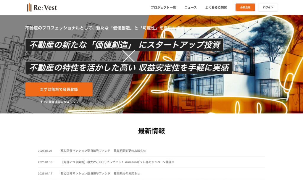 - キャンペーン:登録のみでAmazonギフト券2,000円等、出資を含めて最大5万円分ギフト券がもらえるキャンペーン実施中。