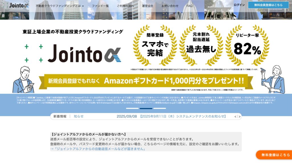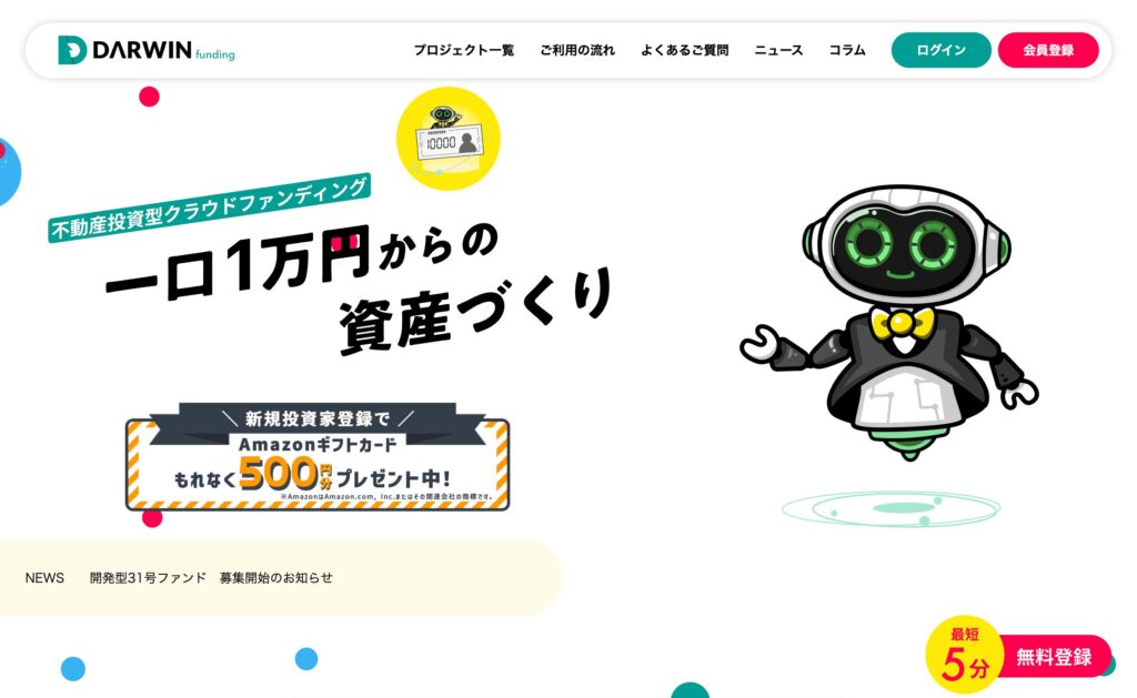 - キャンペーン:登録のみでAmazonギフト券2,000円等、出資を含めて最大5万円分ギフト券がもらえるキャンペーン実施中。