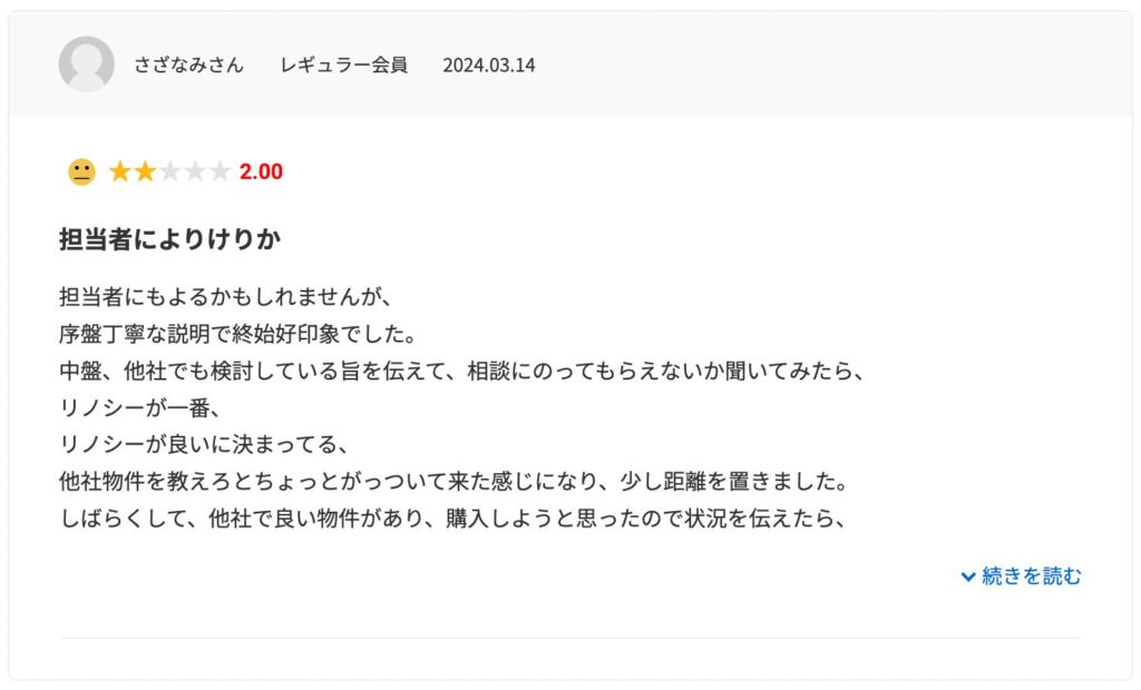 一方で、RENOSYに対する否定的な口コミも存在します。特に営業対応や物件の価格、選択肢の少なさについて不満の声が上がっています。