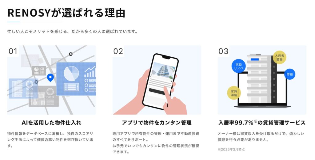 RENOSYは、AI技術を活用した物件選定やアプリによる効率的な管理、グループ全体でのワンストップサポートなど、従来の不動産投資にはない新しい価値を提供しています。特に不動産投資初心者にとって、敷居を下げてくれるサービスであることは間違いありません。
