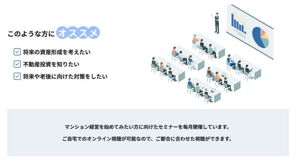 まずは、スカイコートが開催する無料セミナーや個別相談会に参加することから始めます。セミナーでは、不動産投資の基礎知識、税制優遇、融資の仕組み、物件選びのポイントなど、幅広いテーマが扱われます。