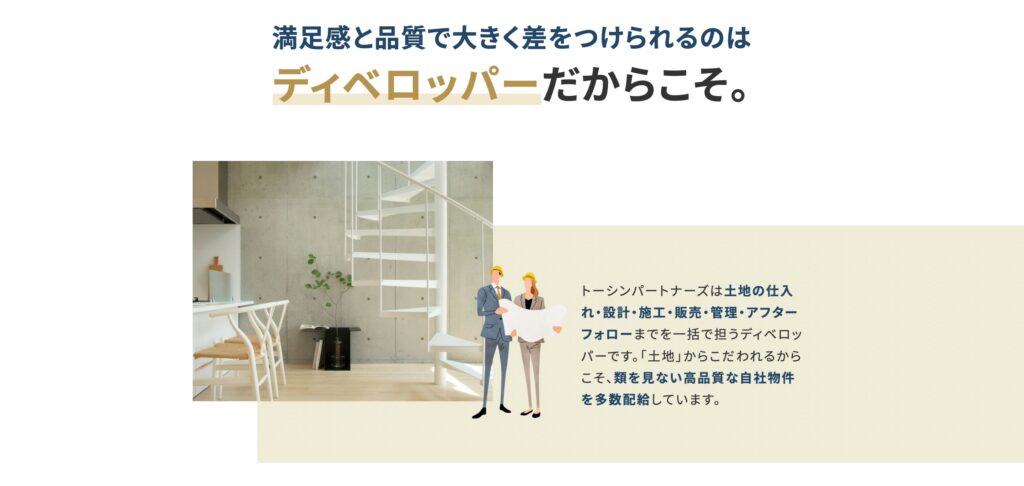 トーシンパートナーズは単なる販売会社ではなく、土地仕入れから建築、販売、管理まで自社で手がけるディベロッパーです。この一貫体制が、同社の強みを生み出しています。