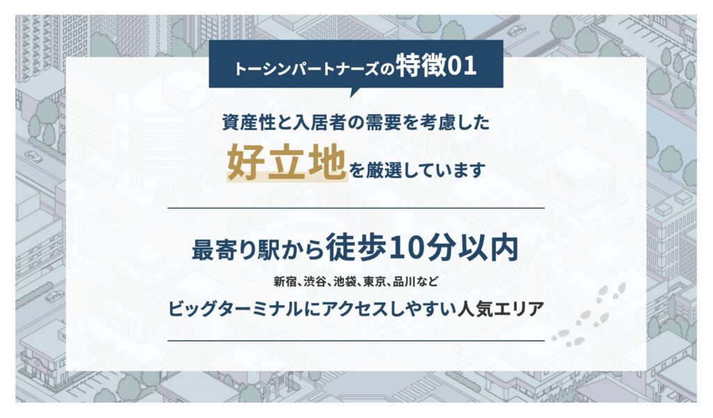 高い入居率と低い滞納率の根本にあるのは、トーシンパートナーズの「都心好立地戦略」です。同社の物件は主要駅から徒歩10分以内など、交通利便性の高い立地に集中しています。