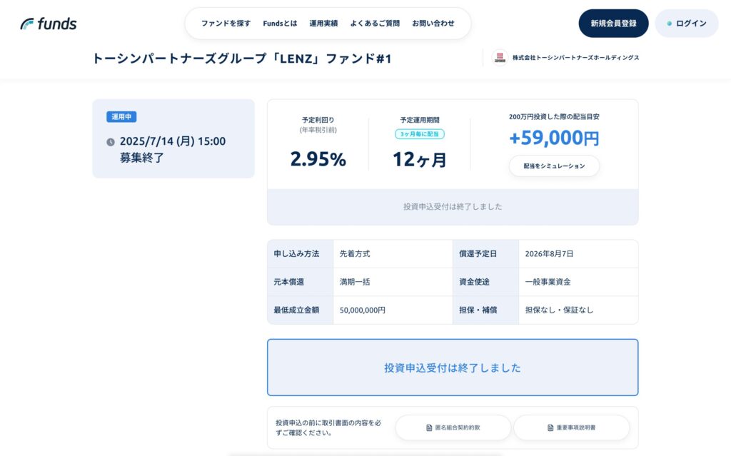 トーシンパートナーズは実物不動産投資が主力ですが、LENZファンドでクラウドファンディング型も提供しています。
