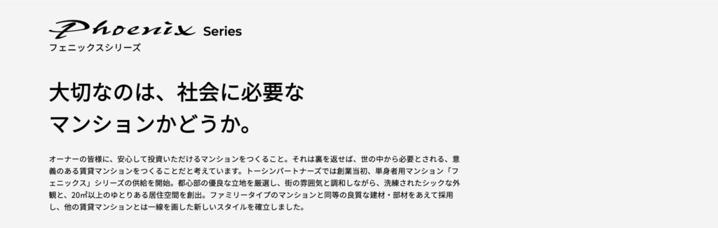 - フェニックスシリーズ:同社の主力ブランドで、1万戸以上の販売実績を誇ります。堅実な立地選定と安定性を重視しており、長期的な資産形成を目指す投資家に向いています。