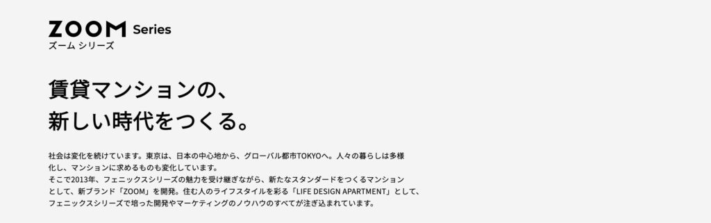 - ZOOMシリーズ:デザイン性を重視した高級志向のブランド。グッドデザイン賞を12年連続で受賞しており、デザイン性の高さが入居者の満足度と長期入居につながっています。