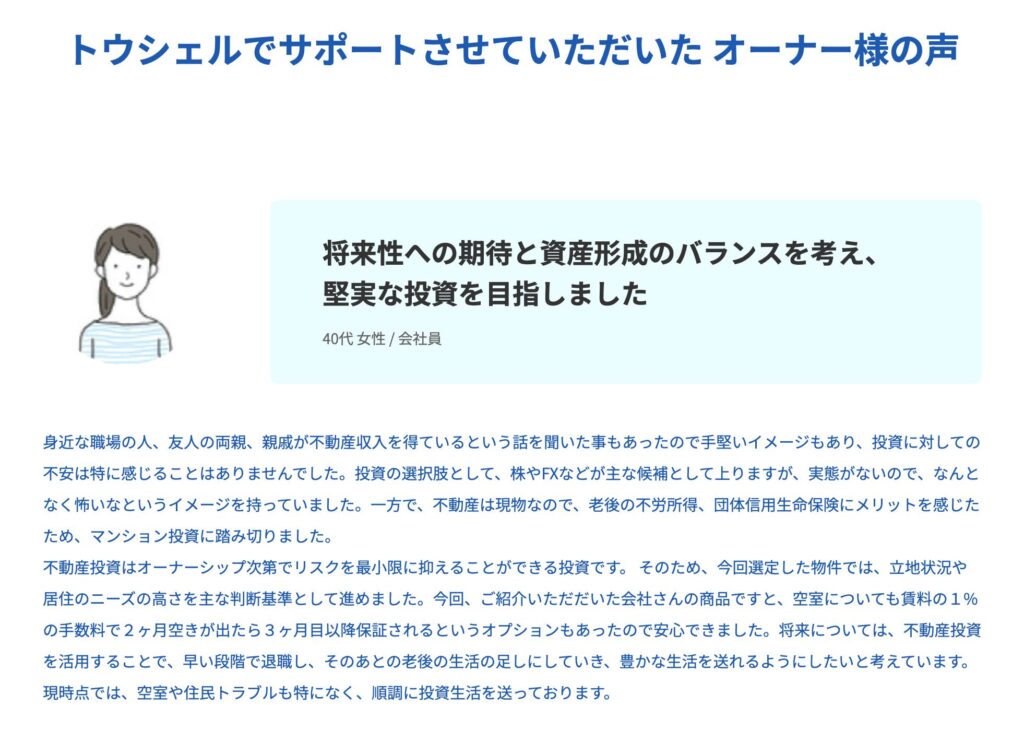 実際にトウシェルを利用した方々の生の声を集め、サービスの実態を明らかにします。