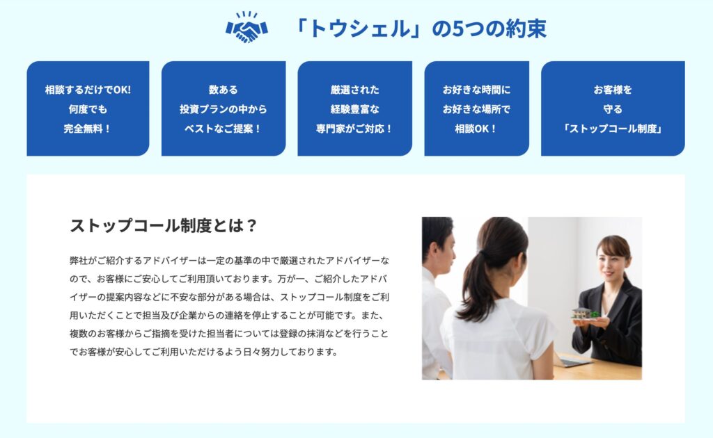 トウシェルの最大の強みは、ストップコール制度による安心感、厳選された優良企業とのマッチング、初心者に優しい説明、オンライン対応といった点にあります。