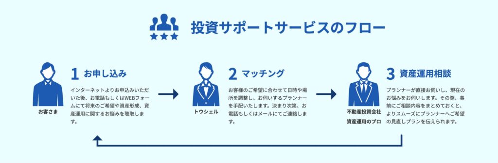 - 利用者がトウシェル経由で不動産投資会社と面談